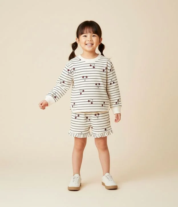 Conjunto infantil confeccionado em algodão waffle com textura suave, trazendo blusa de mangas longas e short com babados delicados na barra. Possui estampa fullprint de cerejas e listras finas, gola redonda e modelagem confortável.