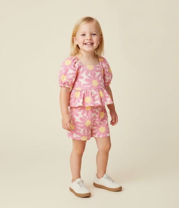 Conjuntinho infantil confeccionado em algodão mais sustentável através de boas práticas ambientais, no modelo curto. Composto de blusa, com decote quadrado, manga curta e babadinhos. Bermuda, com cós elástico. Ambos com estampa de flores.