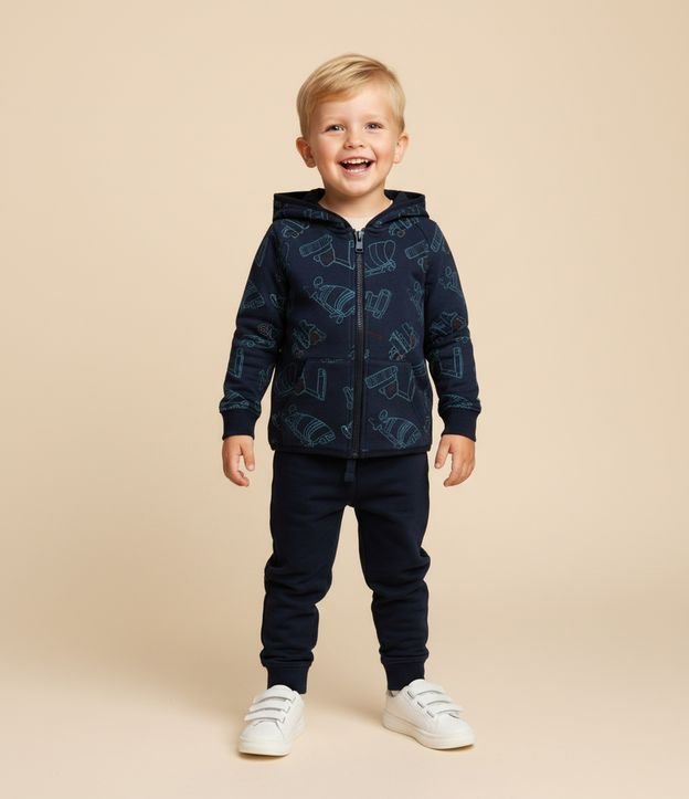 Conjunto infantil composto por jaqueta em fleece com capuz, mangas longas e estampa de caminhões em contorno, trazendo abertura frontal por zíper e bolsos aplicados. Acompanha calça lisa em fleece com cós elástico e punhos de acabamento reforçado.