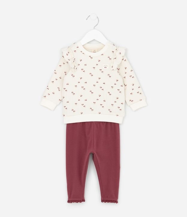 Conjunto Infantil em Matelassê com Cerejinhas e Legging Polar – Tam RN a 18 Meses Off White/Vinho