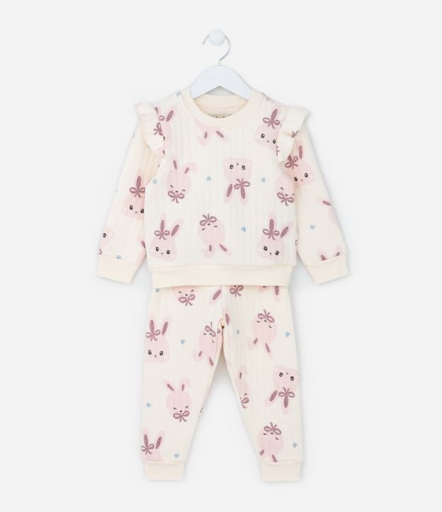 Conjunto infantil confeccionado em algodão, com textura matelassê e estampa de coelhinha com laço. Possui blusão com gola redonda, mangas longas e babados nas cavas, já a calça possui amarração no cós.
