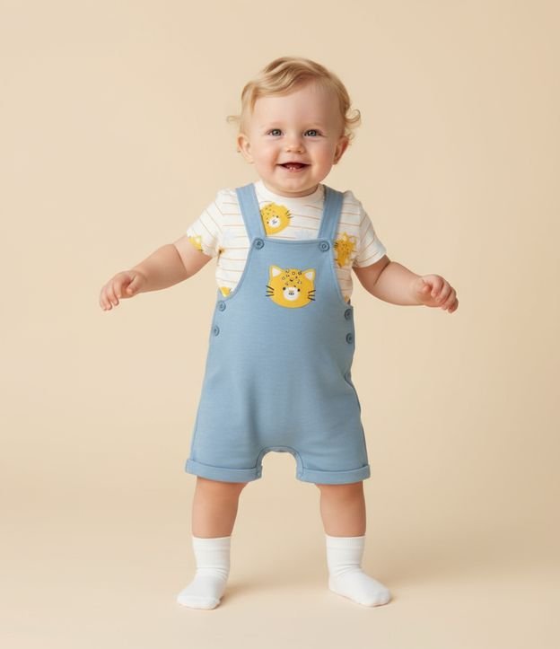 Conjuntinho infantil composto de jardineira em moletom, com alças e carinha de tigre, já o body possui gola redonda, com abotoamento, manga curta, estampa de listras e tigrinho e fechamento no entrepernas.