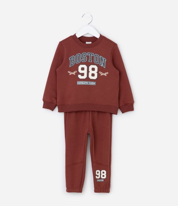 Conjunto infantil confeccionado em algodão certificado BCI, com moletom felpado macio e quentinho. O casaco possui gola redonda, mangas longas e lettering Boston 98 bordado. A calça jogger tem cós elástico com cordão e estampa 98 na perna.