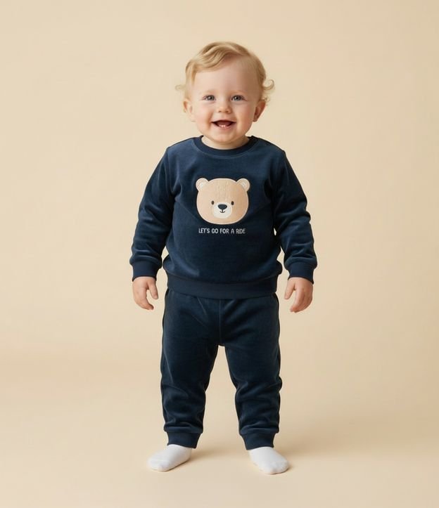 Conjunto Infantil em Plush com Bordado de Urso – Tam 0 a 18 Meses Azul Marinho