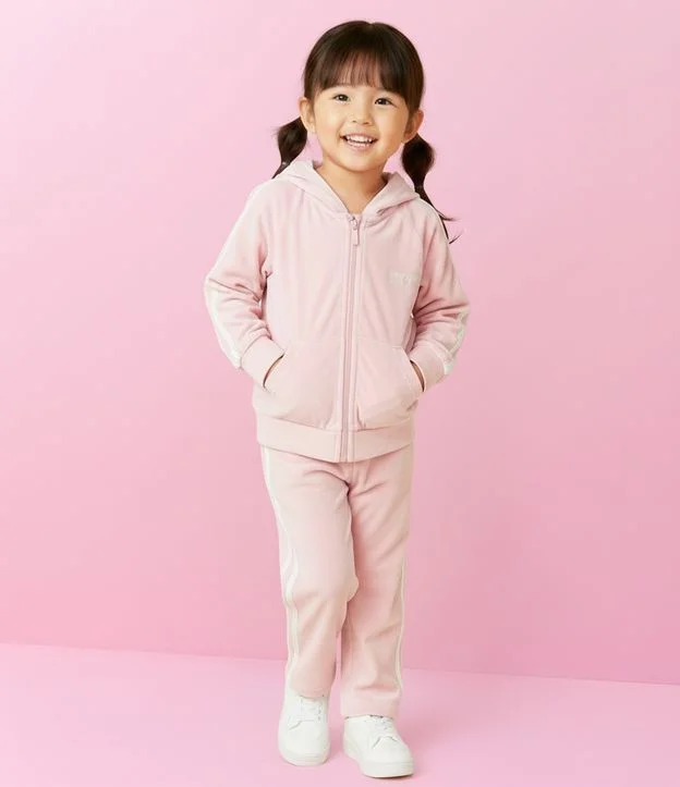 Conjunto infantil confeccionado em plush macio, composto por jaqueta com capuz, mangas longas e fechamento por zíper frontal, além de calça flare com laços laterais e cintura elástica. Jaqueta com bolsos frontais e lettering bordado.