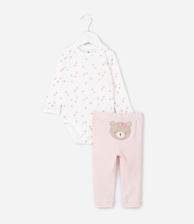 Conjunto Infantil Floral com Body e Calça Ursinha – Tam RN a 18 Meses Off White/Rosa Claro