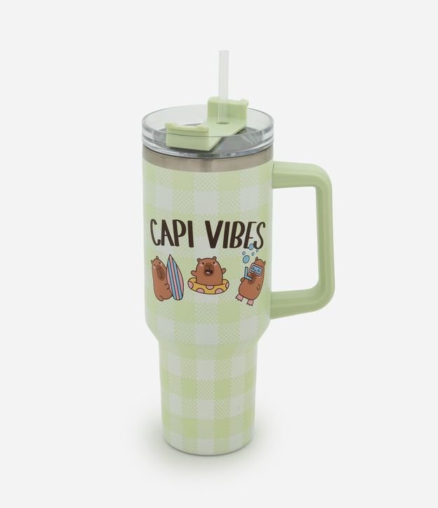 Copo térmico feminino confeccionado em metal com revestimento externo. Possui tampa rosqueável com vedação segura, canudo removível e alça lateral para transporte. Estampa localizada com personagens capivara summer e padrão vichy, ideal para manter bebidas na temperatura desejada.