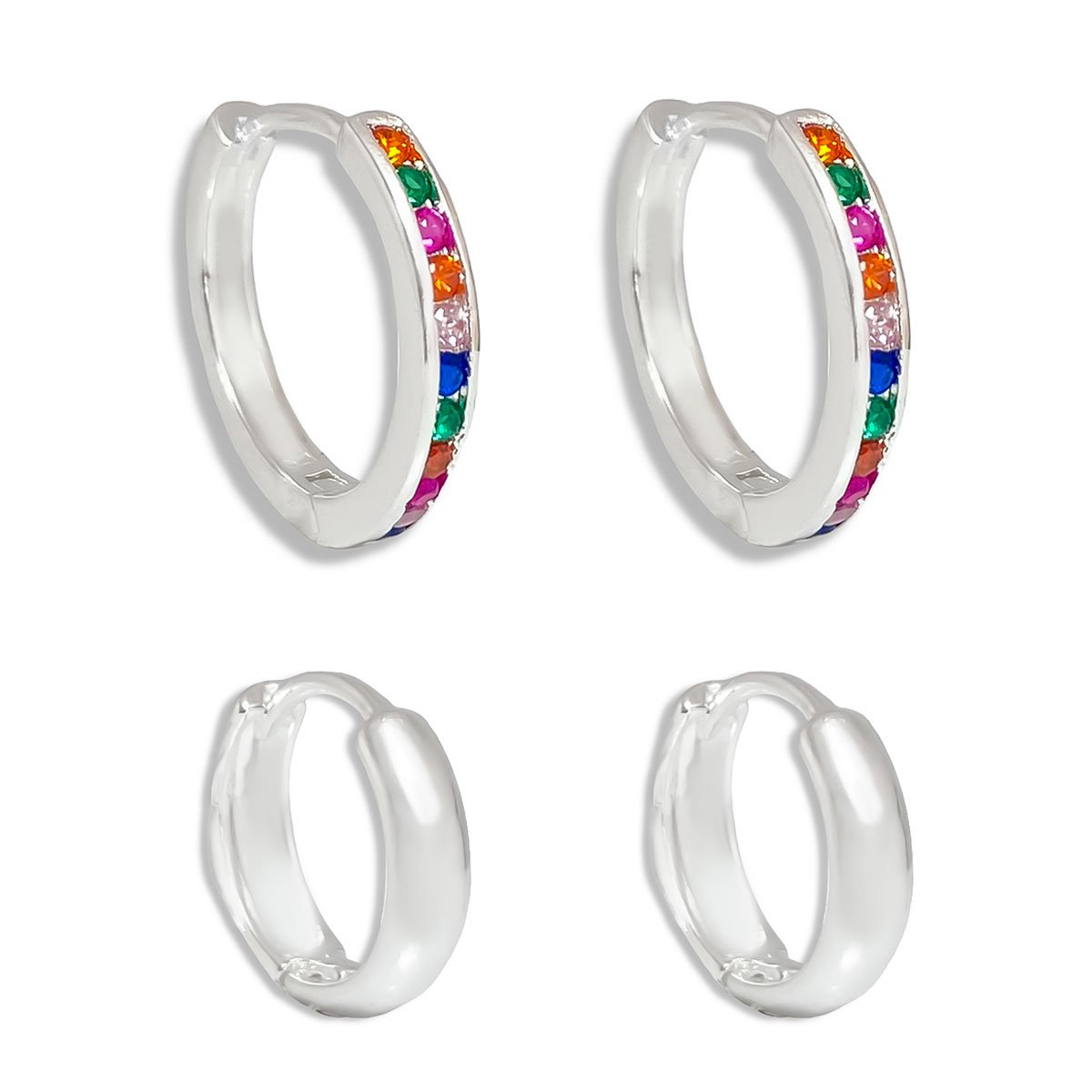 Duo de Argolas Zirconias Coloridas e Lisa Banhado a Prata Prata