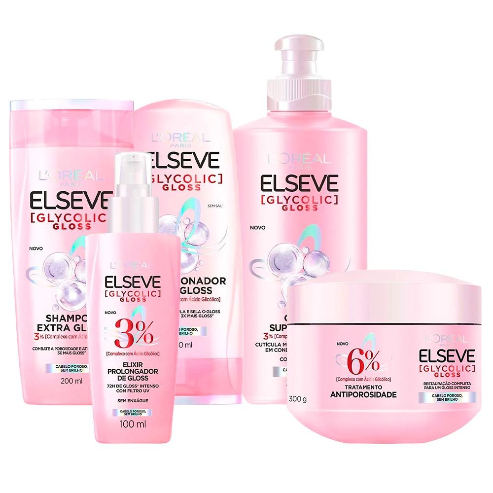Elseve Glycolic Gloss Kit - Shampoo + Condicionador + Creme Super Gloss + Creme de Tratamento + Sérum ÚNICO