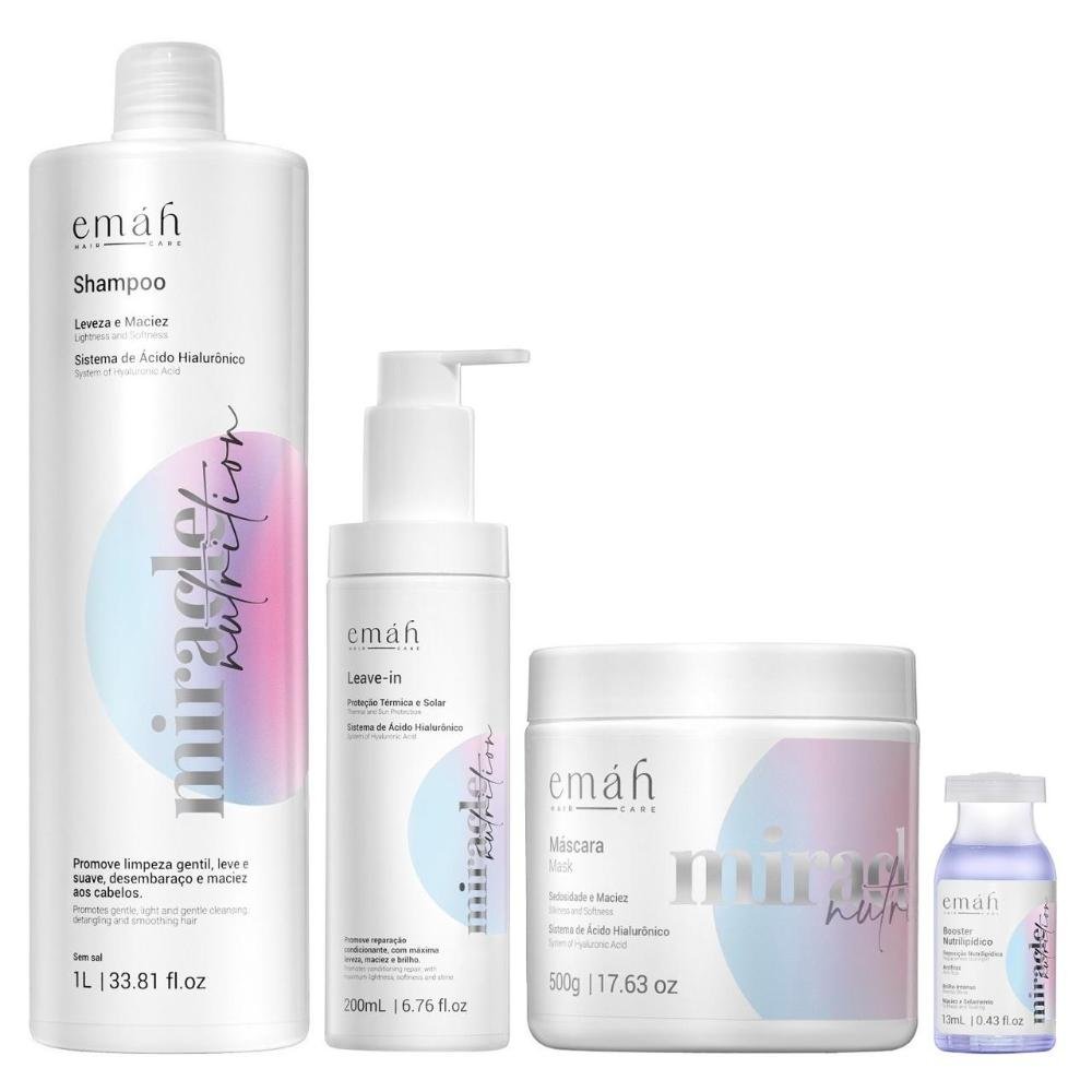 Kit Essencial Emáh Miracle Nutrition: Shampoo 1L + Máscara 500g + Leave-in 200ml + Ampola Booster 13ml
