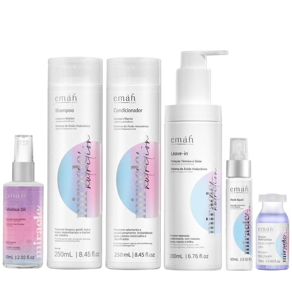 Kit Completo Emáh Miracle Nutrition: Shampoo 250ml + Condicionador 250ml + Máscara Líquida 60ml + Leave-in 200ml + Óleo Restaurador 60ml + Ampola Booster 13ml