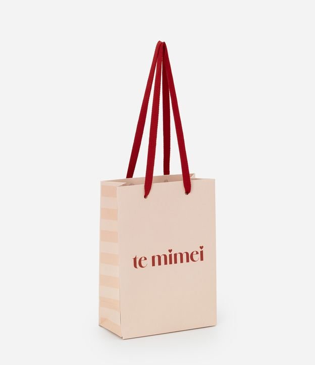 Embalagem de presente feita em papel e papelão mais sustentável, tamanho extra pequeno, com lettering te mimei, alças duplas finas que facilitam o transporte. Ideal para apresentar produtos com charme e praticidade.