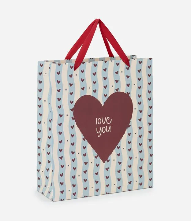 Embalagem de presente confeccionada com papel e papelão mais sustentável. Possui tamanho médio, alças duplas contrastantes e estampa de corações e lettering "love you". Acompanha envelope e cartão de seda para complementar o presente.