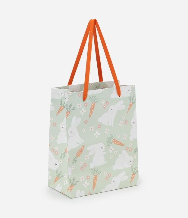 Embalagem de presente confeccionado em papel e papelão Fsc mais sustentável. Possui tamanho pequeno com estampa de coelhos e cenouras, estrutura reforçada, alça chata em fita e acabamento resistente, ideal para presentes temáticos e embalagens sazonais com bom espaço interno.