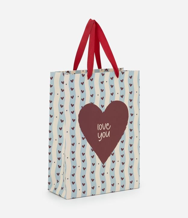 Embalagem de presente confeccionada com papel e papelão mais sustentável. Possui tamanho pequeno, alças duplas contrastantes e estampa de corações e lettering "love you". Acompanha envelope e cartão de seda para complementar o presente.