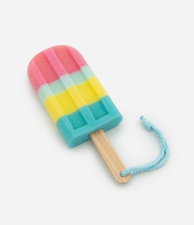 Esponja de banho, modelo espuma, com formato de picolé com palitinho com cordão pendente. Item possui blocos de cores.