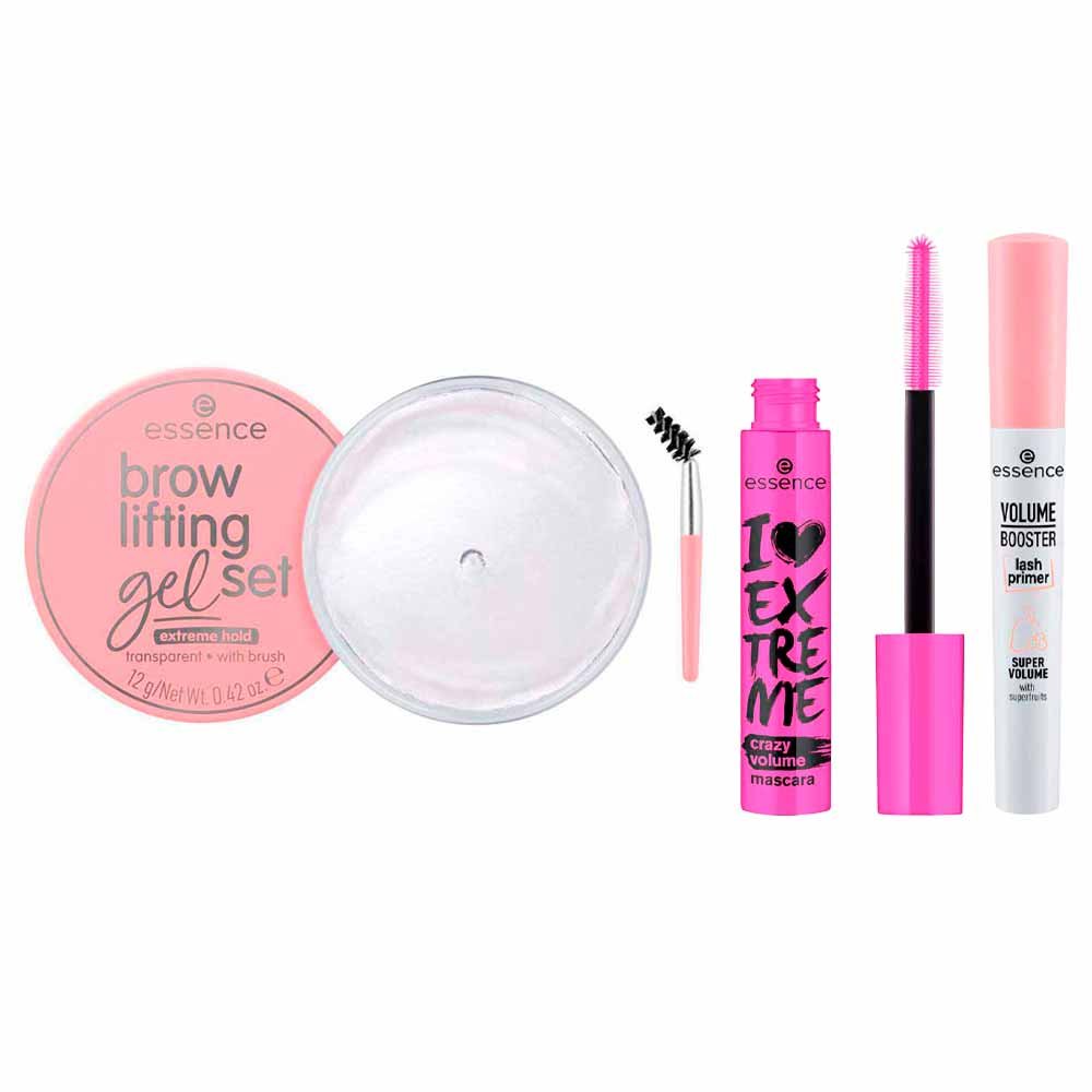 Este kit completo inclui a Máscara de Cílios Essence I Love Extreme Crazy Volume - Black, o Gel de Sobrancelha Essence - Brow Lifting Gel Set e o Primer para Cílios Essence - Volume Booster Lash Primer.