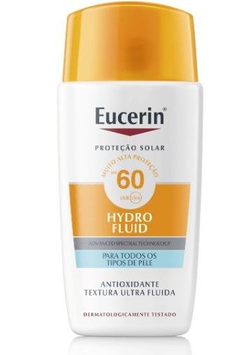 Protetor solar facial. Eucerin Sun Hydro Fluid FPS 60 é indicado para todos os tipos de pele, possui textura hidro fluída que é confortável na pele e fácil de espalhar.