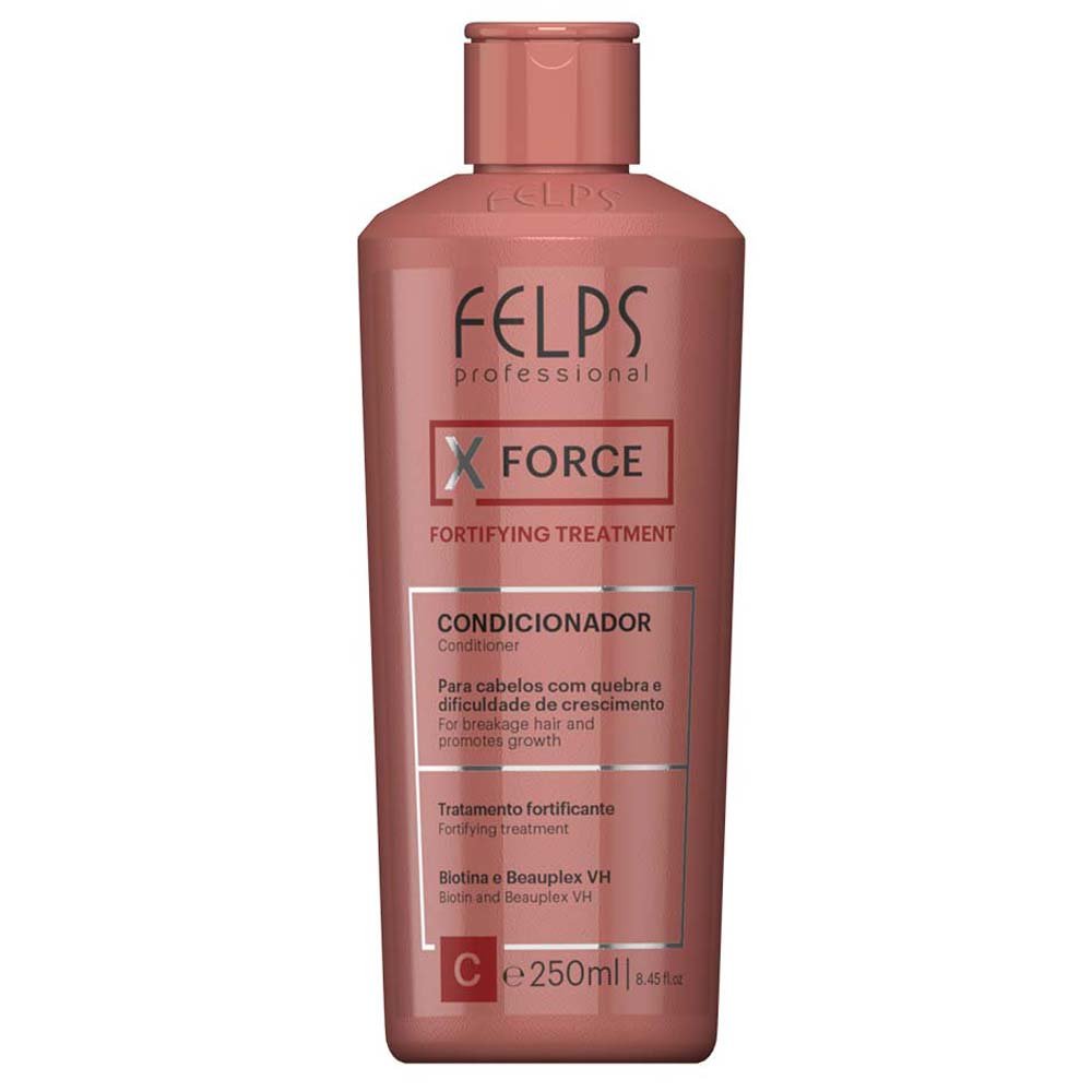 O Condicionador Felps Profissional XForce conta com fórmula enriquecida com Óleos de Coco e de Rícino, Biotina e um poderoso Blend de Vitaminas. Indicado para os apaixonados por cabelos longos, mas que sofrem com a quebra constante dos fios, o produto - que não é testado em animais - assegura luminosidade, resistência e toque macio.