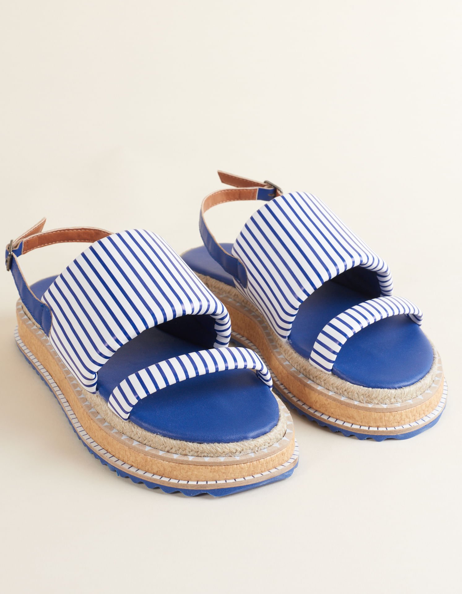 Super estilosa, essa flatform com cabedal em material soft, alternativo ao couro, com listras é um arraso! A palmilha e a tira de fechamento na cor da listra com fivela trazem harmonia ao visual. O solado com detalhe de juta, viras, ráfia, e EVA completa essa peça cheia de personalidade.