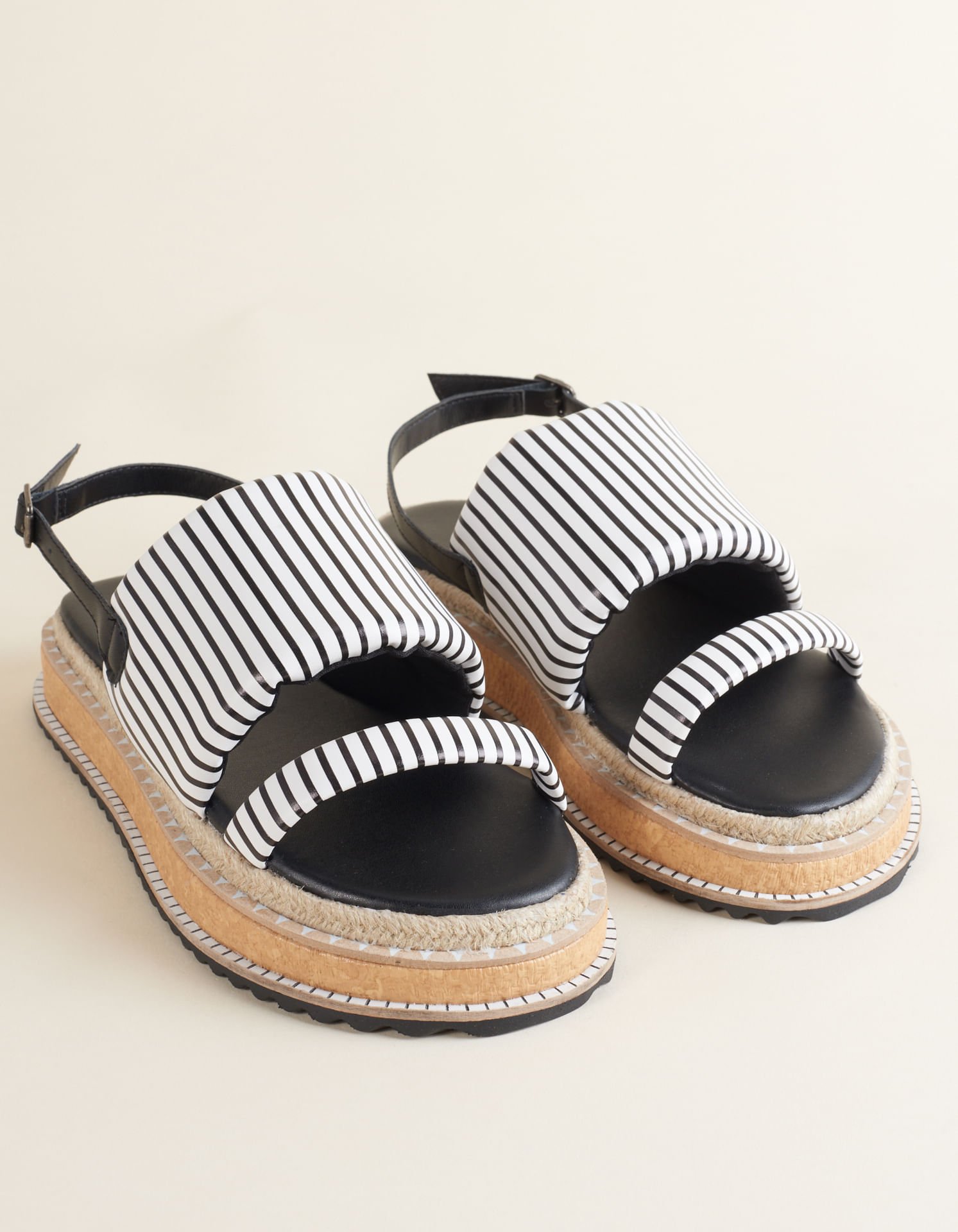 Super estilosa, essa flatform com cabedal em material soft, alternativo ao couro, com listras é um arraso! A palmilha e a tira de fechamento na cor da listra com fivela trazem harmonia ao visual. O solado com detalhe de juta, viras, ráfia, e EVA completa essa peça cheia de personalidade.