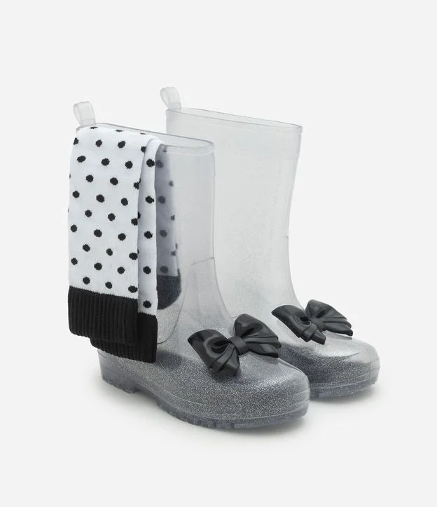 Galocha infantil confeccionada em PVC transparente com glitter, oferecendo proteção para dias chuvosos e visual divertido. Possui laço aplicado no peito do pé, puxador traseiro e solado tratorado. Acompanha meia canelada com poás, garantindo conforto e estilo ao conjunto.