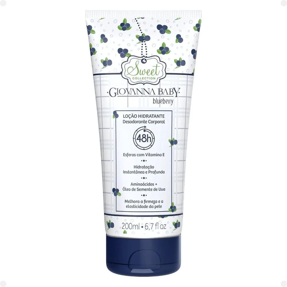 A Loção Hidratante Giovanna Baby Blueberry oferece hidratação profunda por até 48 horas, melhora em até 88% a elasticidade da pele e deixa a pele macia e deliciosamente perfumada. Sua fórmula contém Vitamina E, aminoácidos e óleo de semente de uva, que ajudam a nutrir e revitalizar a pele.