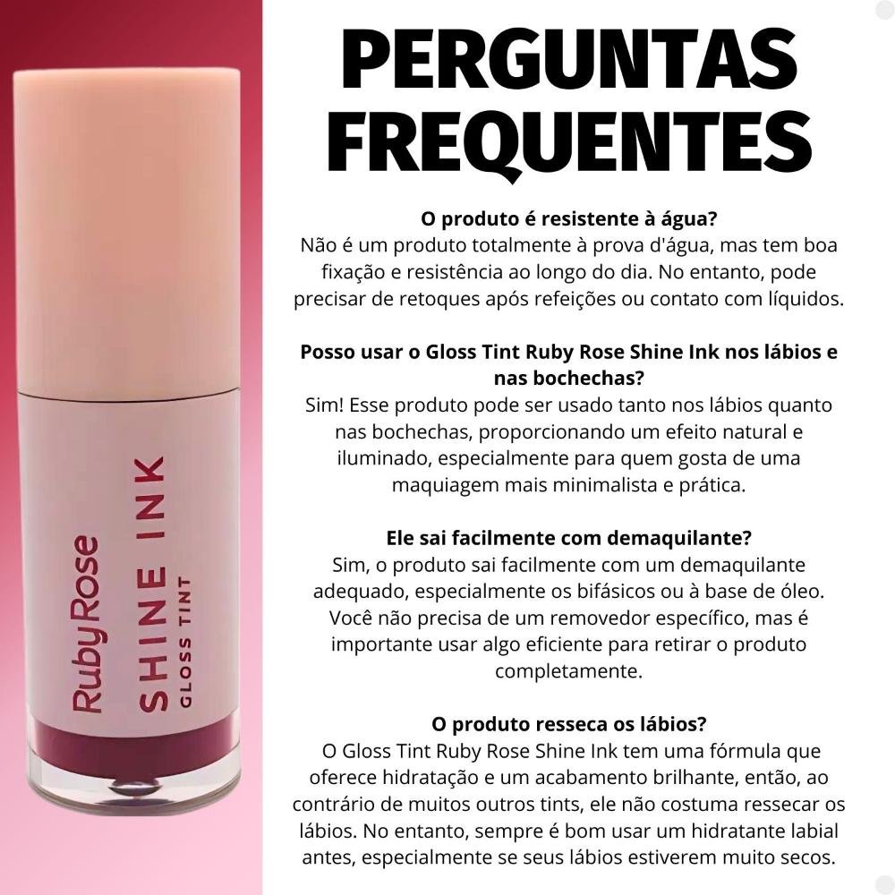 O Gloss Tint Ruby Rose Shine Ink tem uma fórmula que oferece hidratação e um acabamento brilhante, então, ao contrário de muitos outros tints, ele não costuma ressecar os lábios. No entanto, sempre é bom usar um hidratante labial antes, especialmente se seus lábios estiverem muito secos.