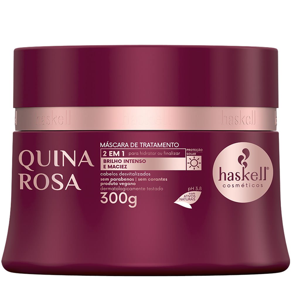 A máscara Extrato de Quina Rosa age formando uma película ao redor dos fios que garante a proteção do cabelo contra as agressões do cotidiano e que ainda restaura os cabelos que já sofreram danos, devolvendo ao cabelo hidratação e nutrição. Indicado para todos os tipos de cabelos e cabelos danificados.