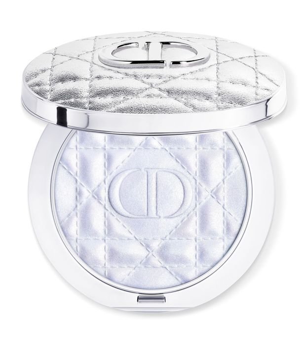 Pó iluminador encaixado em um estojo couture prateado com as iniciais ""CD"" de Christian Dior.