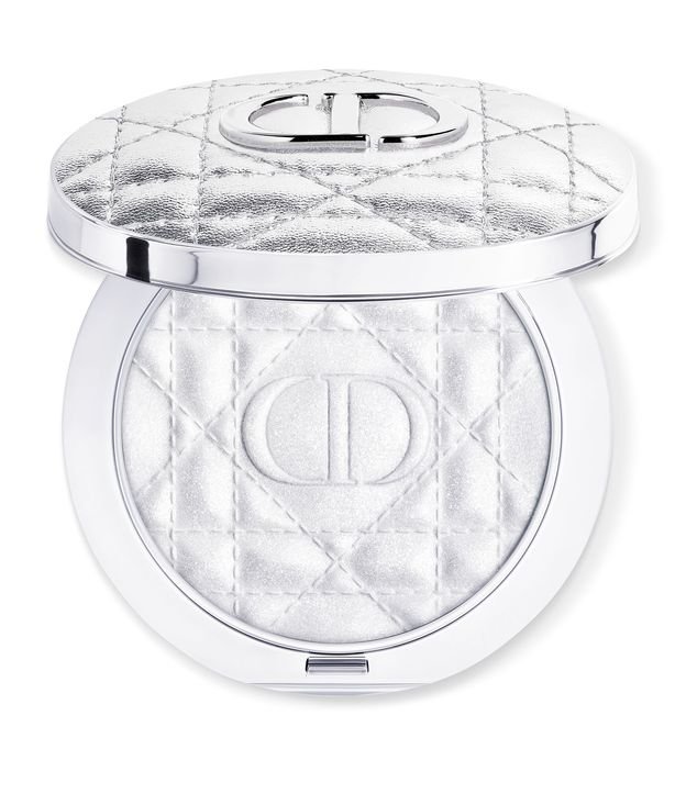 Pó iluminador encaixado em um estojo couture prateado com as iniciais ""CD"" de Christian Dior.