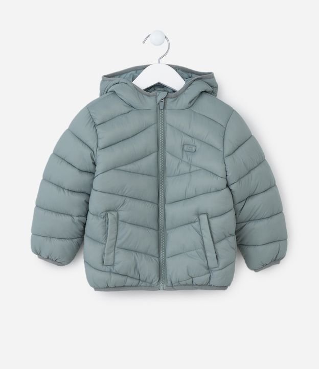 Jaqueta infantil confeccionada em microfibra, básica, com capuz na gola, fechamento por zíper e bolsos. Possui gomos.