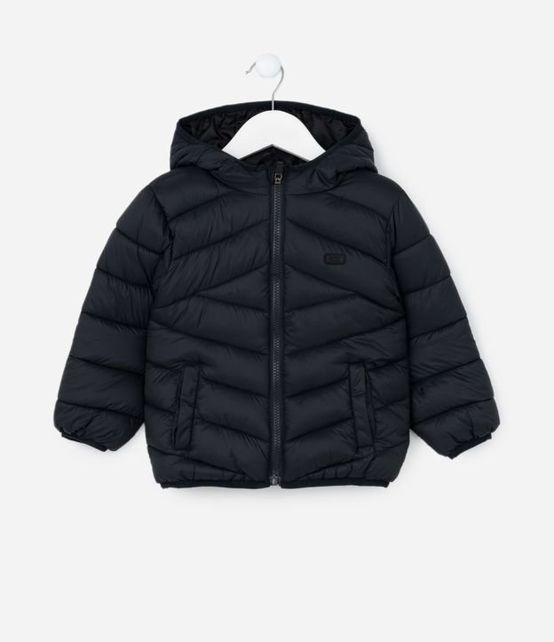 Jaqueta infantil confeccionada em microfibra, básica, com capuz na gola, fechamento por zíper e bolsos. Possui gomos.