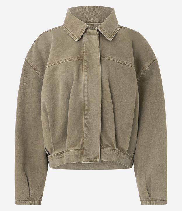 • Jaqueta Bomber em Jeans com Pregas e Gola Polo Marrom Taupe 1