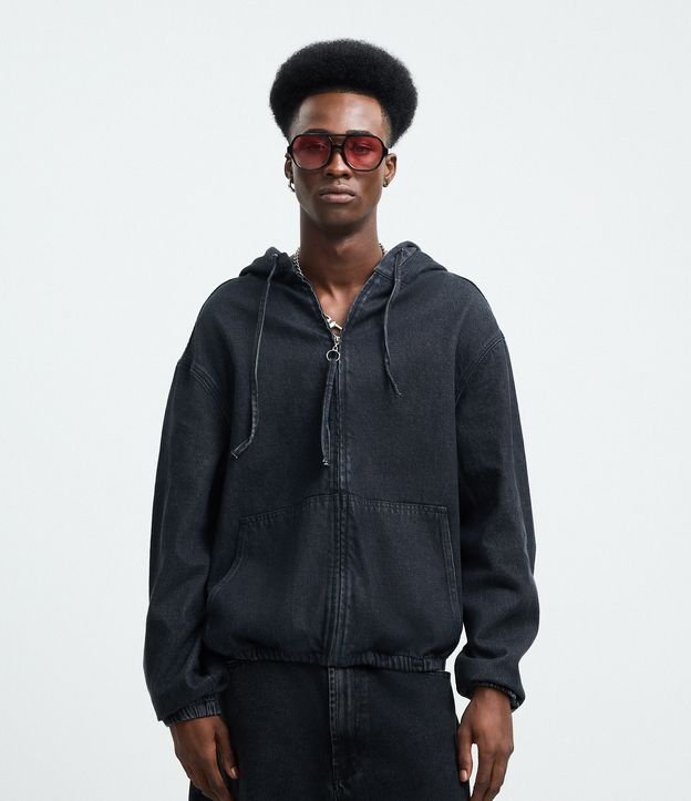 Jaqueta Bomber em Jeans com Zíper e Capuz Jeans Escuro