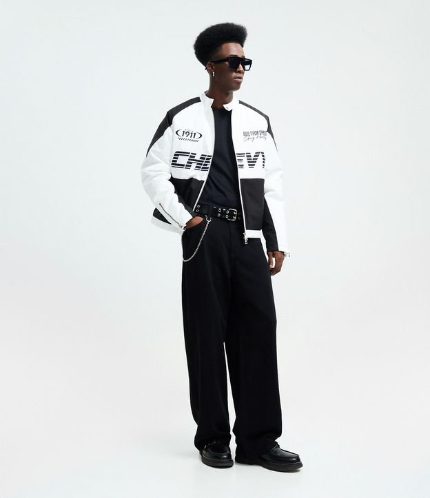 Jaqueta Bomber em Microfibra com Estampa Chevrolet Branco