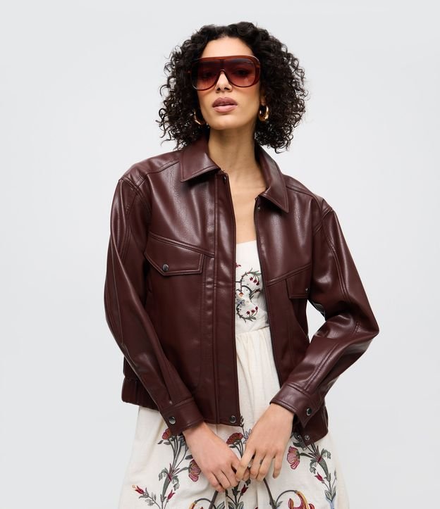 Jaqueta Bomber em PU com Bolsos Frontais Marrom