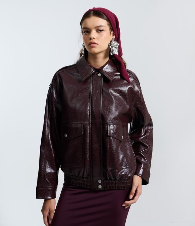 • Jaqueta Bomber em PU Com Bolsos Frontais Bordô 5