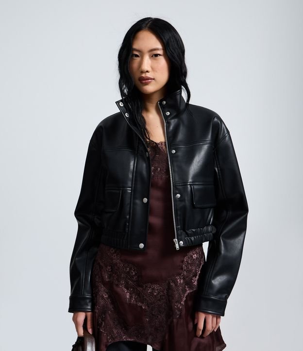 • Jaqueta Bomber em PU com Gola Alta Preto 1