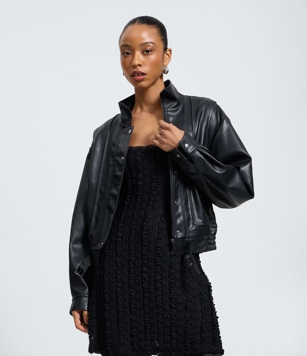 Jaqueta Bomber em PU com Ombro Deslocado Preto