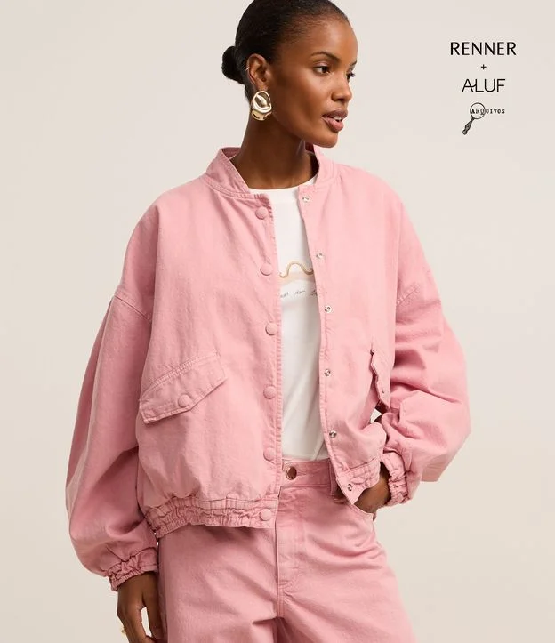 Jaqueta Bomber em Sarja com Botões e Lapelas Rosa