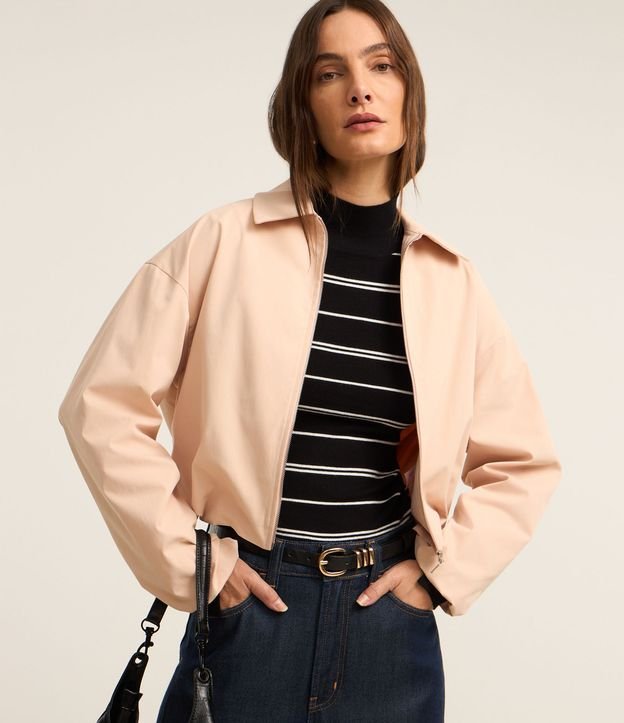 Jaqueta Bomber em Sarja com Drapeado nas Costas e Zíper nas Costas