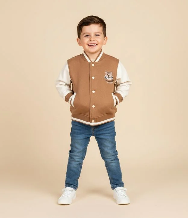 Jaqueta infantil confeccionada em suede, de modelinho bomber, com gola redonda, mangas longas contrastantes, bolsos e fechamento por botões. Possui bordado de tigrinho no peito.