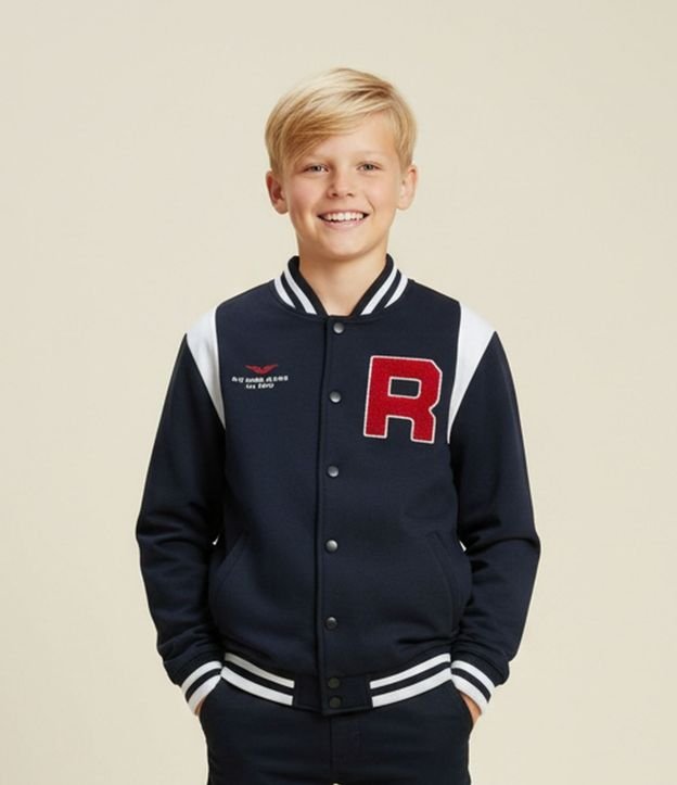 Jaqueta infantil modelo bomber, com golinha e barra listradinha, fechamento por botões de pressão, recortes contrastante e bordado no peito e costas.