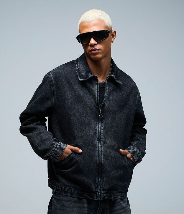 Jaqueta em jeans com visual desgastado e modelagem boxy, oferecendo estilo moderno e urbano. Possui gola tradicional, fechamento por zíper e bolsos laterais funcionais. Peça inspirada pelo álbum Eu venci o mundo do artista Veigh, confeccionado em algodão de certificado BCI.
