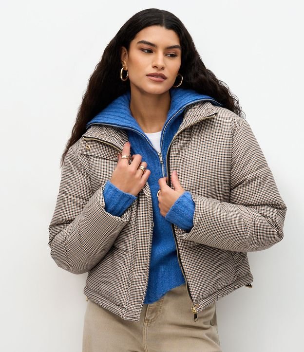 Jaqueta feminina com estampa xadrez mini, modelagem reta e estrutura levemente acolchoada. Possui gola alta, fechamento frontal embutido, mangas longas com regulador nos punhos.