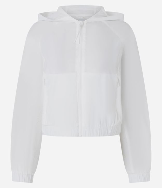 Jaqueta esportiva estilo corta vento cropped, com capuz, sem estampa. Possui saquinho para guardar.