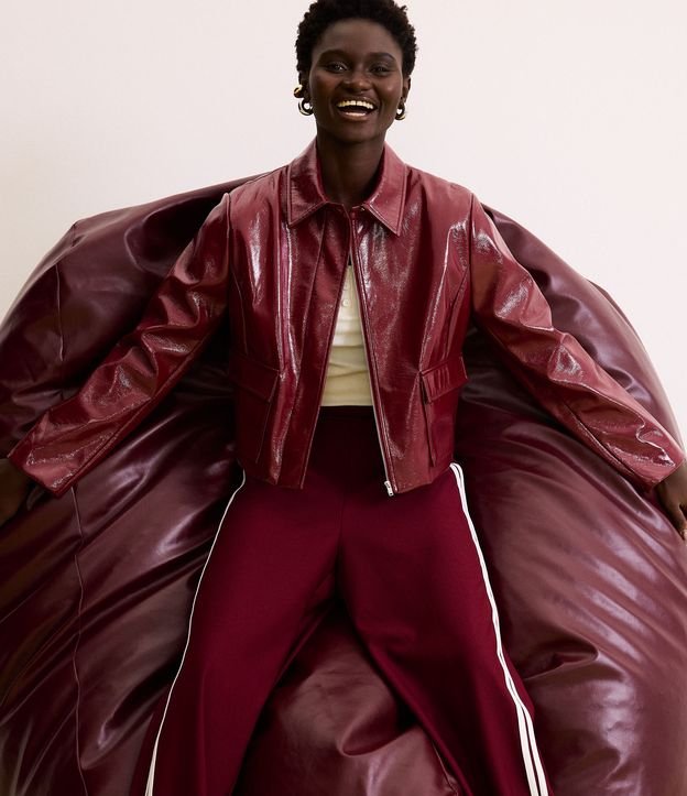Jaqueta Curta em PU com Bolsos Frontais e Zíper Bordô