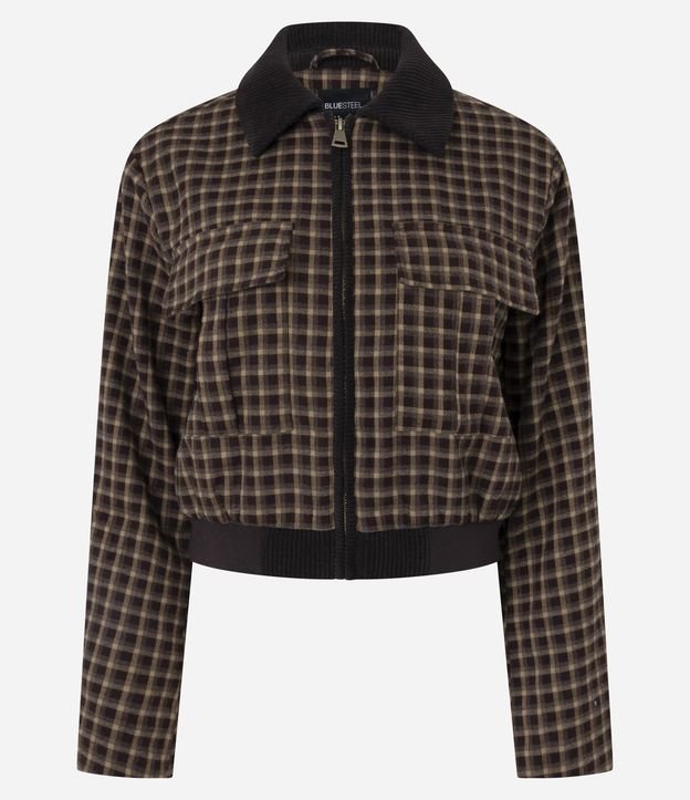 Jaqueta Curta Xadrez em Viscose com Bolsos Frontais Marrom