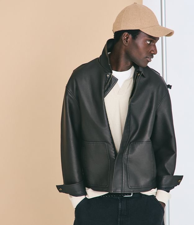 Jaqueta confeccionada em PU com superfície texturizada e acabamento lavado que remete ao estilo dos anos 80. Possui gola colarinho, mangas longas, fechamento por zíper com vista e bolsos frontais amplos. Design urbano e versátil para compor produções casuais modernas.